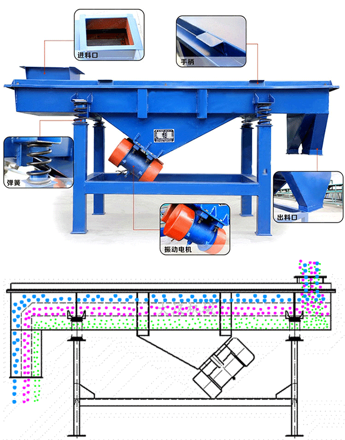 直排篩的原理是通過(guò)振動(dòng)源的作用使物料在篩面做三維運(yùn)動(dòng),這種運(yùn)動(dòng)方式可以使結(jié)塊物料散開(kāi),快速的通過(guò)篩網(wǎng)。精細(xì)物料直接由下部排出,雜物粗料則通過(guò)排渣出料口排出。