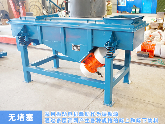直線振動篩采用振動電機激勵作為振動源,使物料在篩網上拋起,同時直線前進。物料從進料器均勻進入篩選機進料口,通過多層篩網產生各種規格的篩上和篩下物料,分別從各自的出口排出,不存在堵塞現象,產量高。