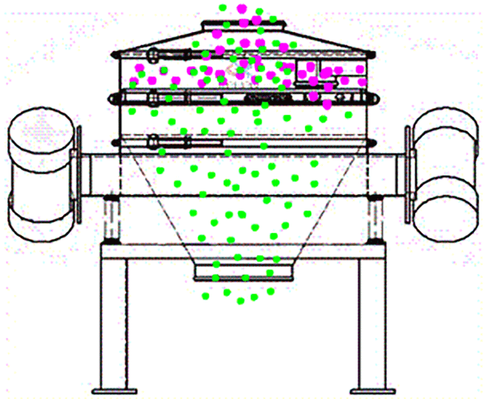 同樣是電機提供振動源,物料從進料口進入,在振動作用下,小顆粒穿過篩板到達出料口;篩機蓋使整個振動篩稱為一個密封環境,物料就不會受到污染或亂飛;彈簧則是在振動狀態下起到減震作用,如果沒有彈簧,振動篩是無法工作的。