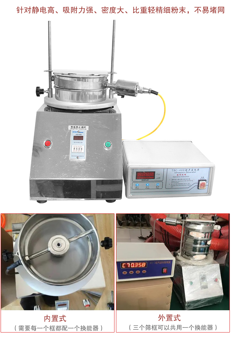 在標準檢驗篩基礎上增加了超聲波篩分系統,解決了篩分200目以上高目數產品或普通檢驗篩難以篩分的易結塊、易帶靜電的產品的難題,并防止篩網堵塞。