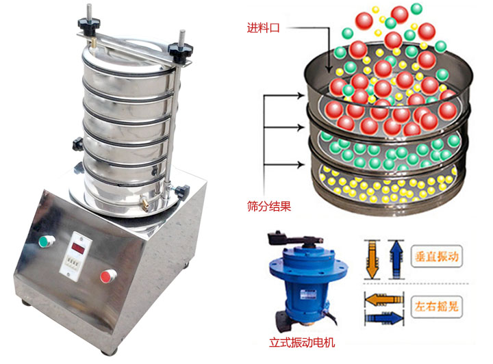 準(zhǔn)試驗篩是以YZU立式振動電機作為整機振動源,通過振動電機帶動上部振動盤振動,再通過振動盤傳導(dǎo)至安放在振動盤上部Φ200篩框上,然后由需要檢測目數(shù)的篩框把小于篩面網(wǎng)孔的物料顆粒篩分至下層篩框,如此層層篩選,使每層試驗篩內(nèi)只留相同粒度的物料,達(dá)到不同粒度的分離并確定此物料的粒度組成,使Φ200型篩框中的物料能非常有效的起到過濾、分級、篩分目的。