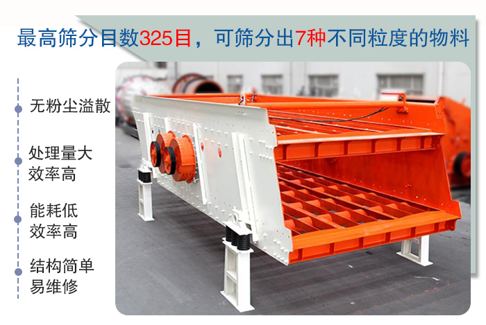 具有能耗低、效率高、結(jié)構(gòu)簡(jiǎn)單、易維修、全封閉結(jié)構(gòu)、無粉塵溢散等特點(diǎn)。最高篩分目數(shù)325目,可篩分出7種不同粒度的物料。