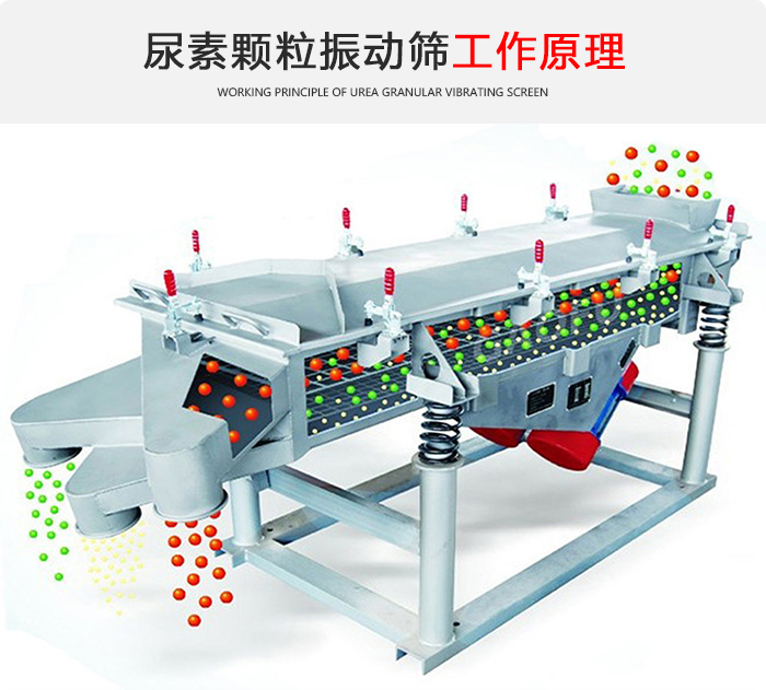 尿素顆粒振動篩主要由篩箱、篩框、篩網(wǎng)、振動電機、電機臺座、減振彈簧、支架等組成。