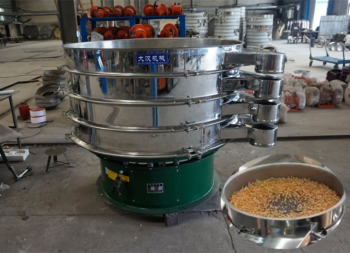 將速凍玉米倒入篩機中,在振動電機的作用下,速凍玉米在篩面上由中間向四周擴散,期間,速凍玉米根據粒度通過篩網,大于篩網尺寸的速凍玉米將停留在篩面上并從出料口排出,小于篩孔的速凍玉米將進入下層篩網繼續篩分,直至被排出。